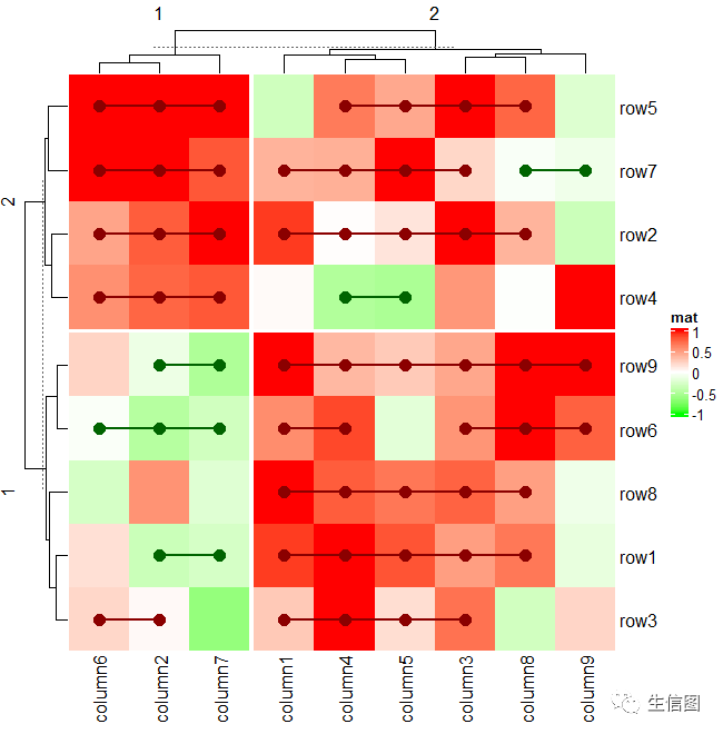 Heatmap(small_mat, name = "mat", col = col_fun,row_km = 2, column_km = 2,layer_fun = function(j, i, x, y, w, h, fill) {# restore_matrix() is explained after this chunk of codeind_mat = restore_matrix(j, i, x, y)for(ir in seq_len(nrow(ind_mat))) {for(ic in seq_len(ncol(ind_mat))[-1]) {ind1 = ind_mat[ir, ic-1]ind2 = ind_mat[ir, ic]v1 = small_mat[i[ind1], j[ind1]]v2 = small_mat[i[ind2], j[ind2]]if(v1 * v2 > 0) {col = ifelse(v1 > 0, "darkred", "darkgreen")grid.segments(x[ind1], y[ind1], x[ind2], y[ind2],gp = gpar(col = col, lwd = 2))grid.points(x[c(ind1, ind2)], y[c(ind1, ind2)],pch = 16, gp = gpar(col = col), size = unit(4, "mm"))}}}})