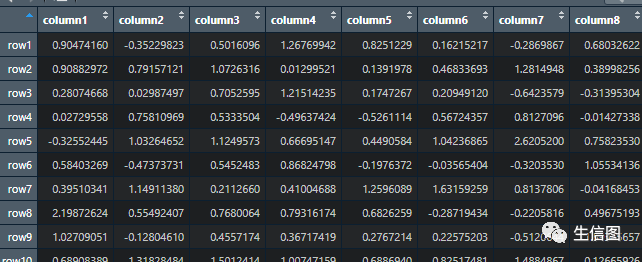 set.seed(123)nr1 = 4; nr2 = 8; nr3 = 6; nr = nr1 + nr2 + nr3nc1 = 6; nc2 = 8; nc3 = 10; nc = nc1 + nc2 + nc3mat = cbind(rbind(matrix(rnorm(nr1*nc1, mean = 1, sd = 0.5), nr = nr1),matrix(rnorm(nr2*nc1, mean = 0, sd = 0.5), nr = nr2),matrix(rnorm(nr3*nc1, mean = 0, sd = 0.5), nr = nr3)),rbind(matrix(rnorm(nr1*nc2, mean = 0, sd = 0.5), nr = nr1),matrix(rnorm(nr2*nc2, mean = 1, sd = 0.5), nr = nr2),matrix(rnorm(nr3*nc2, mean = 0, sd = 0.5), nr = nr3)),rbind(matrix(rnorm(nr1*nc3, mean = 0.5, sd = 0.5), nr = nr1),matrix(rnorm(nr2*nc3, mean = 0.5, sd = 0.5), nr = nr2),matrix(rnorm(nr3*nc3, mean = 1, sd = 0.5), nr = nr3)))mat = mat[sample(nr, nr), sample(nc, nc)]rownames(mat) = paste0("row", seq_len(nr))colnames(mat) = paste0("column", seq_len(nc))