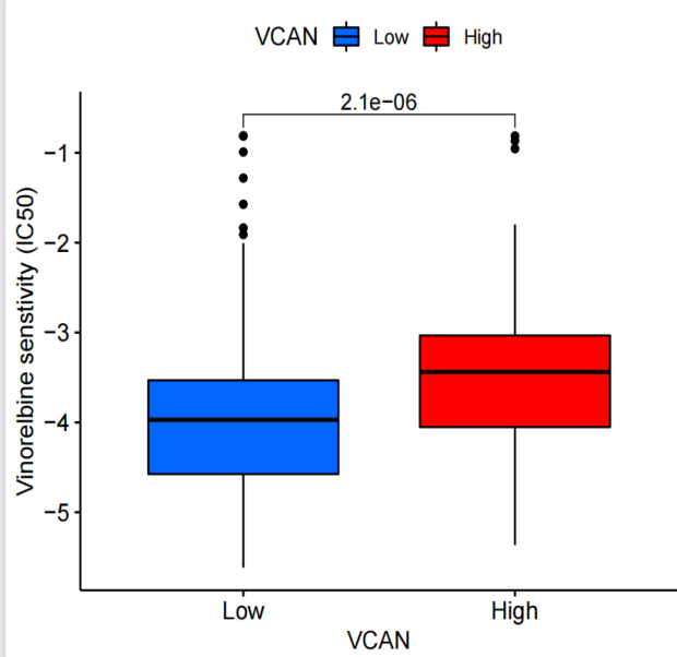 rt=as.matrix(rt)rownames(rt)=rt[,1]exp=rt[,2:ncol(rt)]# 将处理后的矩阵中的表达数据提取出来。dimnames=list(rownames(exp),colnames(exp))#创建矩阵 data 设置维度名称。#在R中,维度名称允许你为矩阵的行和列指定标签,以便更好地理解矩阵中的数据data=matrix(as.numeric(as.matrix(exp)),nrow=nrow(exp),dimnames=dimnames)#将数据矩阵 exp 转换为 data 矩阵。具体步骤如下:# as.matrix(exp): 将数据框 exp 转换为数值型矩阵。# as.numeric(...): 将数值型矩阵中的数据转换为数值。# matrix(...): 使用转换后的数值和指定的行数(由 nrow(exp) 给出)和维度名称(由 dimnames 给出)创建一个新的矩阵 data。#删掉正常样品data=avereps(data)#函数 avereps 对矩阵 data 进行处理。avereps 函数的目的是求每一行的平均值data=data[rowMeans(data)>0.5,]#将矩阵 data 进一步处理,只保留行平均值大于0.5的行。#排除那些平均表达量较低的样本,以便更关注表达丰度较高的样本。group=sapply(strsplit(colnames(data),"\-"), "[", 4)#将矩阵 data 的列名进行处理,提取出每列名称的第四个部分(使用 "-" 作为分隔符)。用于从样本名中获取样本的分组信息。group=sapply(strsplit(group,""), "[", 1)#将每个字符串中的每个字符作为单独的元素。然后,使用 [ 函数提取每个字符串的第一个字符。这可能是为了进一步处理样本分组信息。group=gsub("2","1",group)#用 gsub 函数将所有字符串中的字符 "2" 替换为 "1"。这可能是将样本分组信息进行标准化或重新编码。data=data[,group==0]#将矩阵 data 进一步处理,只保留样本分组信息为 "0" 的列。这可能是为了只保留特定样本分组的数据。data=t(data)#对矩阵 data 进行转置,将行列互换rownames(data)=gsub("(.*?)\-(.*?)\-(.*?)\-.*", "\1\-\2\-\3", rownames(data))#用正则表达式处理矩阵 data 的行名,从中提取出所需的信息,并重新设置行名。data=t(avereps(data))#根据目标基因的表达量对样品进行分组geneExp=as.data.frame(t(data[gene,,drop=F]))geneExp$Type=ifelse(geneExp[,gene]>median(geneExp[,gene]), "High", "Low")#从矩阵 data 中选择与目标基因相关的行,#并使用逗号 , 来指定列的选择。drop=F 参数确保即使只选择一列,结果也会保持为矩阵而不是向量。for(drug in allDrugs){#预测药物敏感性possibleError=tryCatch({senstivity=pRRopheticPredict(data, drug, selection=1, dataset = "cgp2016")},error=function(e) e)#使用 tryCatch 函数,尝试执行药物敏感性预测。#如果在执行过程中出现错误,将在错误处理函数中捕获错误并存储在 possibleError 中。if(inherits(possibleError, "error")){next}#如果 possibleError 包含了一个错误,那么这行代码将跳过当前药物,继续下一个循环迭代。senstivity=senstivity[senstivity!="NaN"]#移除药物敏感性结果中的 "NaN" 值,将有效的药物敏感性值存储在变量 senstivity 中。senstivity[senstivity>quantile(senstivity,0.99)]=quantile(senstivity,0.99)#对药物敏感性值进行处理,将高于 0.99 分位数的值设置为 0.99。这可能是为了去除极端异常值,以获得更好的可视化效果#将表达数据与药物敏感性的结果进行合并sameSample=intersect(row.names(geneExp), names(senstivity))#找到 geneExp 中与药物敏感性结果具有相同样本名称的样本。geneExp=geneExp[sameSample, "Type",drop=F]#从 geneExp 中选择与药物敏感性结果相同的样本,仅保留 "Type" 列。senstivity=senstivity[sameSample]#从药物敏感性结果中选择与 geneExp 相同样本的敏感性值。rt=cbind(geneExp, senstivity)#将基因表达分组和药物敏感性结果合并到一个数据框中。#设置比较组rt$Type=factor(rt$Type, levels=c("Low", "High"))#将 "Type" 列转换为因子,设定水平为 "Low" 和 "High"。type=levels(factor(rt[,"Type"]))comp=combn(type, 2)my_comparisons=list()#创建一个空列表来存储分组比较for(i in 1:ncol(comp)){my_comparisons[[i]]<-comp[,i]}#将所有可能的分组比较添加到 my_comparisons 列表中。#获取高低表达组差异的pvaluetest=wilcox.test(senstivity~Type, data=rt)#执行 Wilcoxon 秩和检验,检验药物敏感性是否在不同基因表达分组之间存在显著差异。diffPvalue=test$p.valueif(diffPvalue <pFilter){< span></pFilter){<>#绘制箱线图boxplot=ggboxplot(rt, x="Type", y="senstivity", fill="Type",xlab=gene,ylab=paste0(drug, " senstivity (IC50)"),legend.title=gene,palette=c("#0066FF","#FF0000"))+stat_compare_means(comparisons=my_comparisons)pdf(file=paste0("durgSenstivity.", drug, ".pdf"), width=5, height=4.5)#创建一个 PDF 文件,用于保存绘制的箱线图,文件名根据当前药物命名。print(boxplot)dev.off()}}