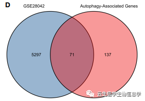 首先在GSE28042中确定了5368个差异表达基因(图1C),并且在232个自噬相关基因(AAGs)的基础上鉴定了208个AAGs的表达序列。将差异基因与208个AAGs取交集,共获得71个差异表达的自噬相关基因(图1D)。