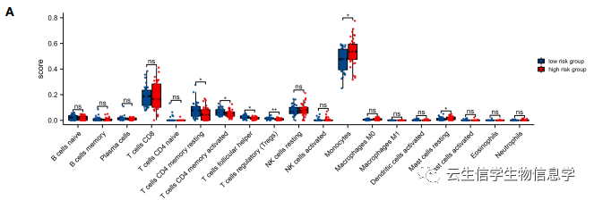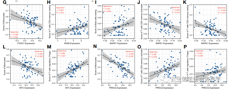 使用CIBERSORT算法评估高风险评分组和低风险评分组之间22种免疫细胞浸润差异(图5A),并分析自噬相关基因与特异性免疫细胞之间的相关性(图5G-P)。