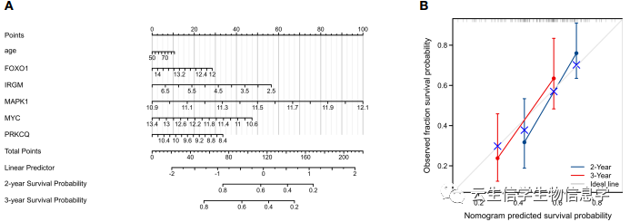 使用单变量Cox分析从71个自噬相关的差异基因中鉴定出11个与IPF预后相关的基因(图2A),再用LASSO回归分析筛选5个特征基因构建预后模型(图2B, C)。在训练队列和验证集中进行Kaplan-Meier生存分析并利用ROC曲线评估预测性能(图2C, 图3)。最后构建了一个基于年龄和五个筛选的AAGs的列线图,并利用校准曲线评估其准确性(图4)。