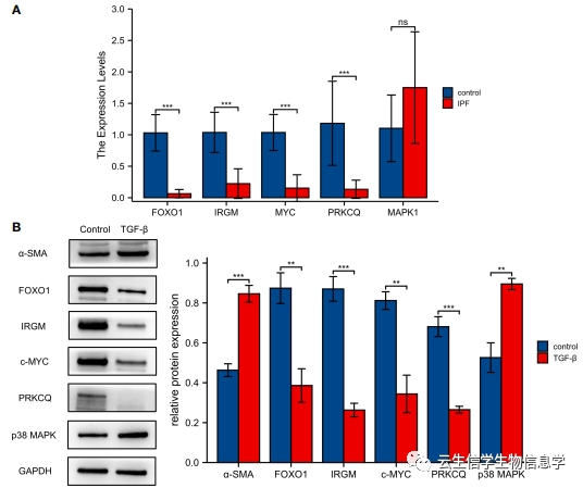 使用临床PBMC样本进一步通过qRT-PCR验证五种自噬相关基因的表达(图7A),利用 MRC-5细胞建立IPF模型,通过WB验证五种自噬相关基因的表达(图7B)。