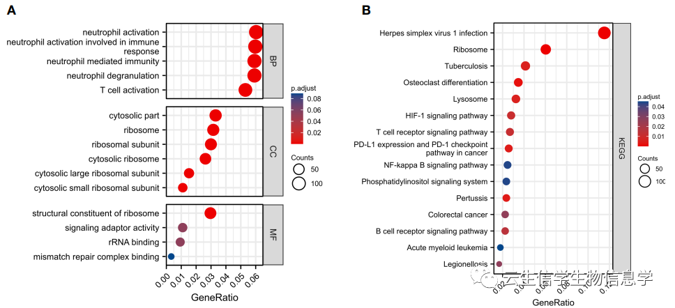 为了揭示与自噬相关预后模型相关的潜在生物学功能和途径,使用GO富集和KEGG途径分析分析了高风险和低风险评分组之间的差异基因(图6A, B)。