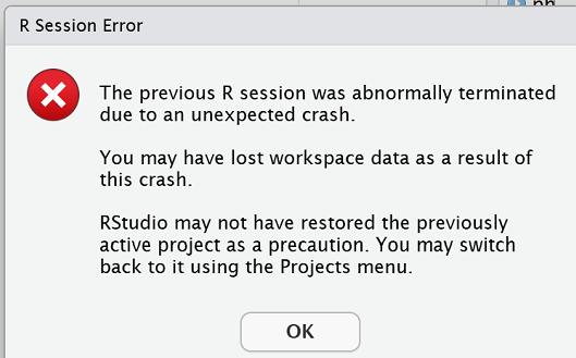nohup Rscript ... &、screen或tmux)。这样即使关闭网页或断网,任务也不会中断,更适合运行数据预处理、模型训练等关键步骤。 - R 崩溃多因资源问题或底层冲突,建议及时保存数据通常在使用 RStudio Server 时,偶尔会出现 R 崩溃(如“R session disconnected”或“R session Crashd” 见下图),其常见原因包括:内存不足:处理大型数据、复杂图形或并行计算时,可能瞬间耗尽系统资源;底层 Bug 或代码包冲突:部分 R 包在调用底层 C/C++ 接口时可能导致非预期错误,进而导致 R 内核崩溃。这类问题在技术上很难完全避免。因此,我们建议用户在进行复杂分析或内存占用较高的操作前,务必提前保存工作数据和中间结果(如使用