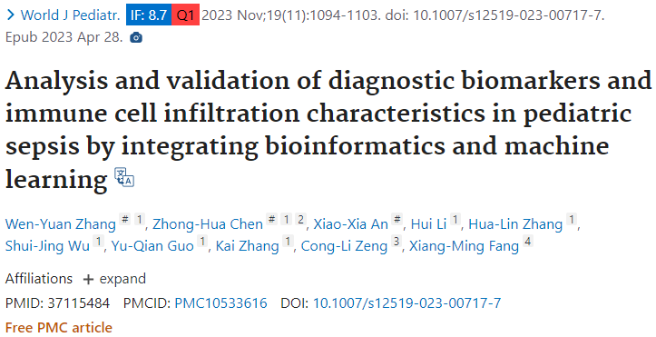 - 本研究所用的公共数据库是儿童脓毒症的数据,选投的期刊是由国家儿童健康与疾病临床医学研究中心、国家儿童区域医疗中心、浙江大学医学院附属儿童医院主办的《世界儿科杂志》(World Journal of Pediatrics,WJP)最新影响因子8.7分,此期刊对国人友好,儿科的小伙伴们也可以看下这个期刊哦;