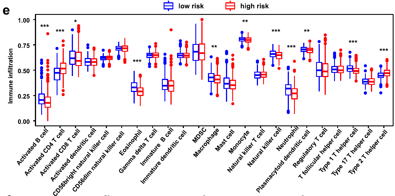 因为之前的研究发现位于中心体扩增层级顶端的蛋白CEP192与免疫抑制肿瘤微环境密切相关。因此,作者接下来基于ESTIMATE和ssGSEA算法,探讨了CARGs特征与肿瘤微环境之间的关系。首先,ESTIMATE分析显示,高风险组肿瘤纯度高于低风险组(图4a),而基质评分与ESTIMATE评分相反(图4b、c)。高风险组免疫评分虽无统计学意义,但呈下降趋势(图4d)。此外,ssGSEA分析显示,多种抗致瘤性免疫细胞类型的比例在高风险组中显著降低(图4e)。相反,免疫抑制性Th2和总CD4+ T细胞在高风险组大量富集(图4e)。这些观察结果表明,高风险组的肿瘤可能形成免疫抑制微环境,损害抗肿瘤免疫,促进肿瘤生长。