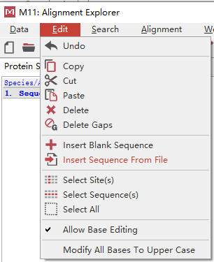 紧接着,我们可以点击”Edit”,选择”Insert Sequence From File”导入我们需要比对的序列,序列文件格式为.fasta格式。