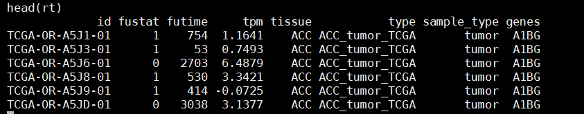 #数据框。然后对数据框进行处理,调整列名和数据格式。将存活时间(futime)#从天转换为年,将tpm转换为数值型数据。
