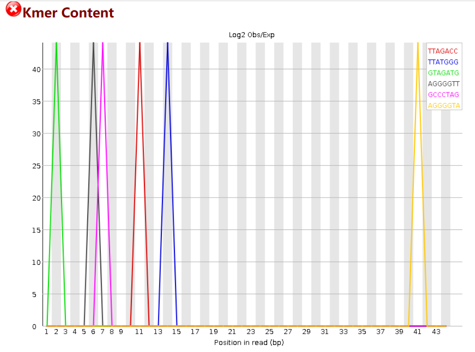 Kmer Content说明:Kmer是指连续的长度为k的核苷酸序列片段,通过计算和比较这些片段的频率,可以了解样本中不同核苷酸的相对丰度。在FastQC的Kmer Content模块中,通常会显示各个Kmer长度(例如,4、5、6等)的频率分布图。每个Kmer长度代表了不同长度的核苷酸序列片段。分析这些片段的频率分布可以得到样本中各种核苷酸组成的相对比例。这里的kmer分布有异常出现,可能是有污染的问题。