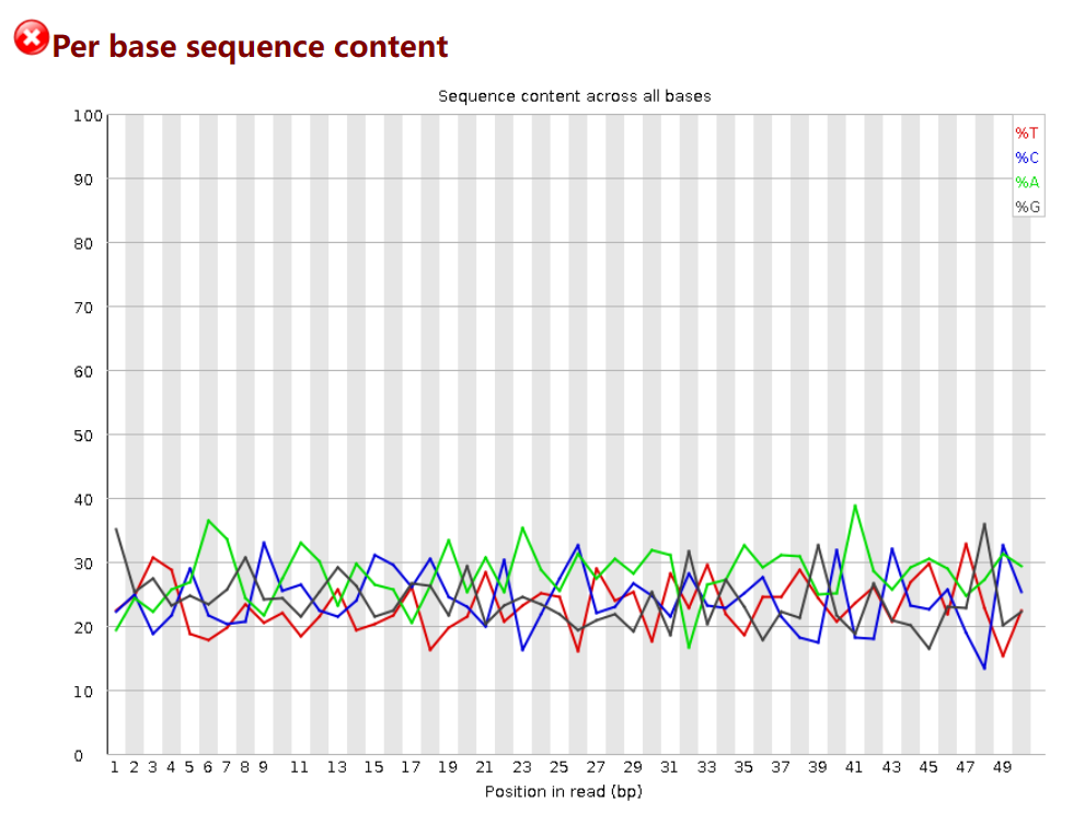 Per base sequence content说明:碱基分布,对所有reads的每一个位置,统计ATCG四种碱基的分布,横轴为位置,纵轴为碱基含量,正常情况下每个位置每种碱基出现的概率是相近的,四条线应该平行且相近。当部分位置碱基的比例出现bias时,即四条线在某些位置纷乱交织,往往提示我们有overrepresented sequence的污染。本结果每种碱基频率有明显的差别,说明有污染。当任一位置的A/T比例与G/C比例相差超过10%,报’WARN’;当任一位置的A/T比例与G/C比例相差超过20%,报’FAIL’。