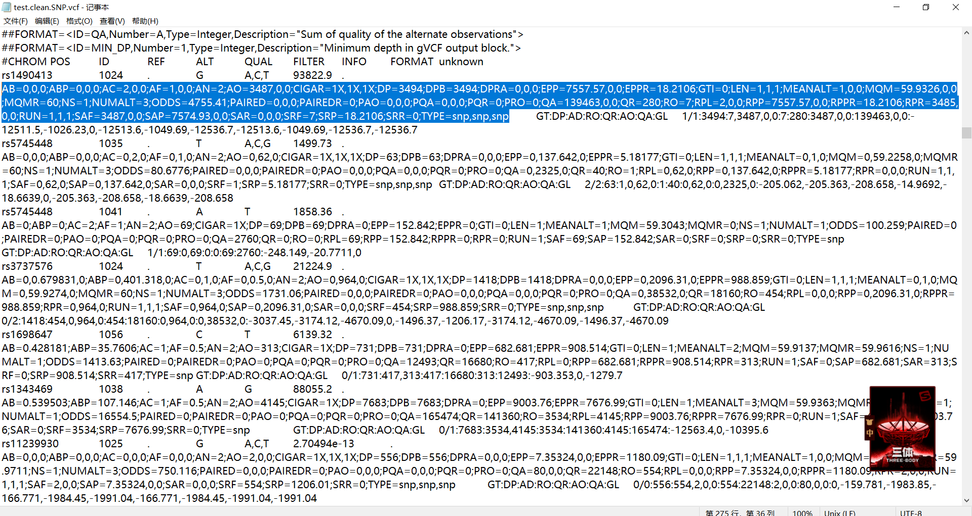 - DP:总深度,表示该位点在该样本中的测序深度,即用于该位点的测序读数总数。在这个例子中,总深度是3494。