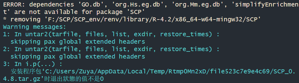 # 在安装SCP的过程中可能会出现某一包无法安装的情况,我们可以使用conda进行安装,安装方法与安装devtools一致,在这小果就不赘述啦。