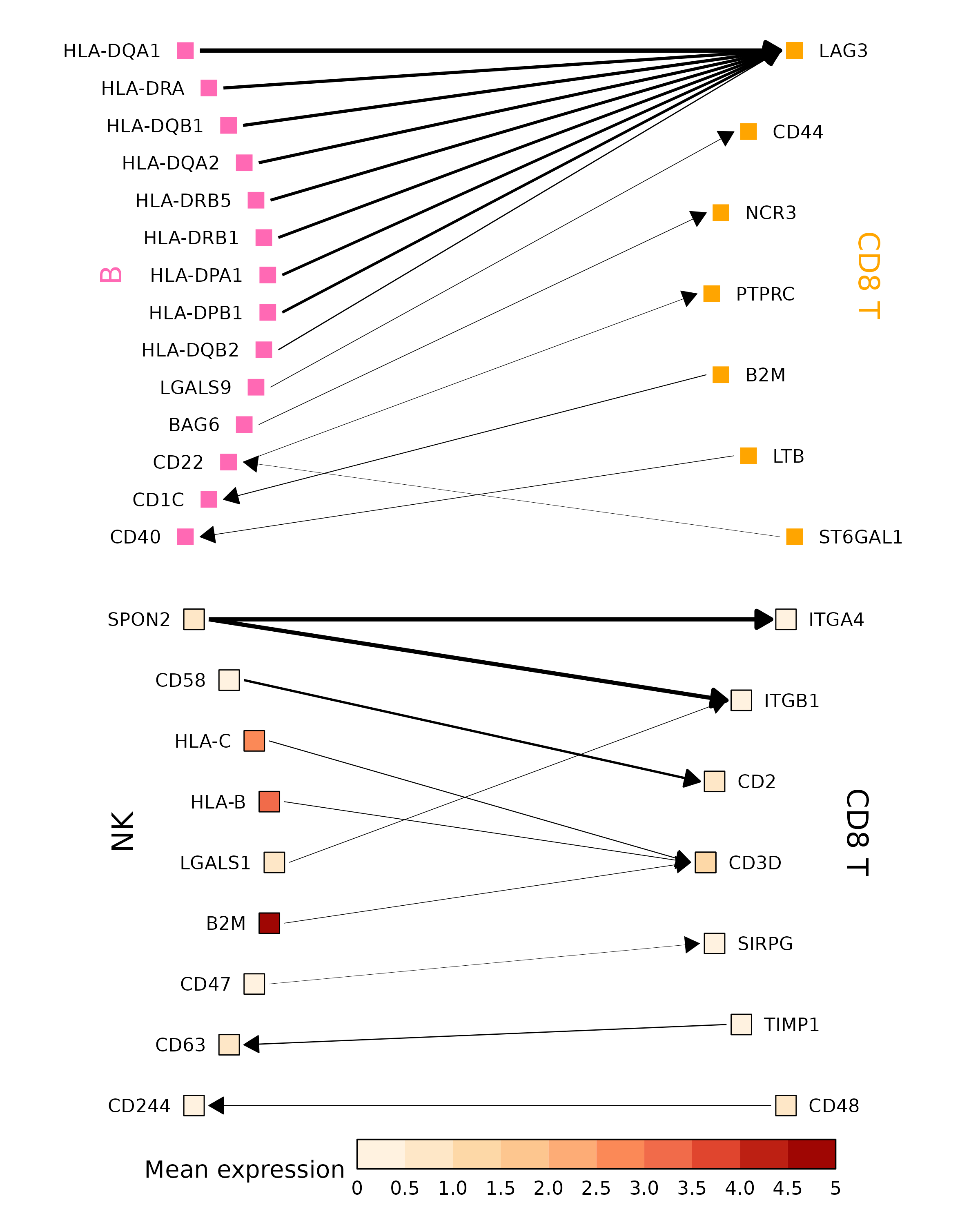 cc_arrow(toy_data, cell_types = c(‘NK’, ‘CD8 T’), option = ‘B’, exp_df = toy_exp, n_top_ints = 10, palette = ‘OrRd’)
