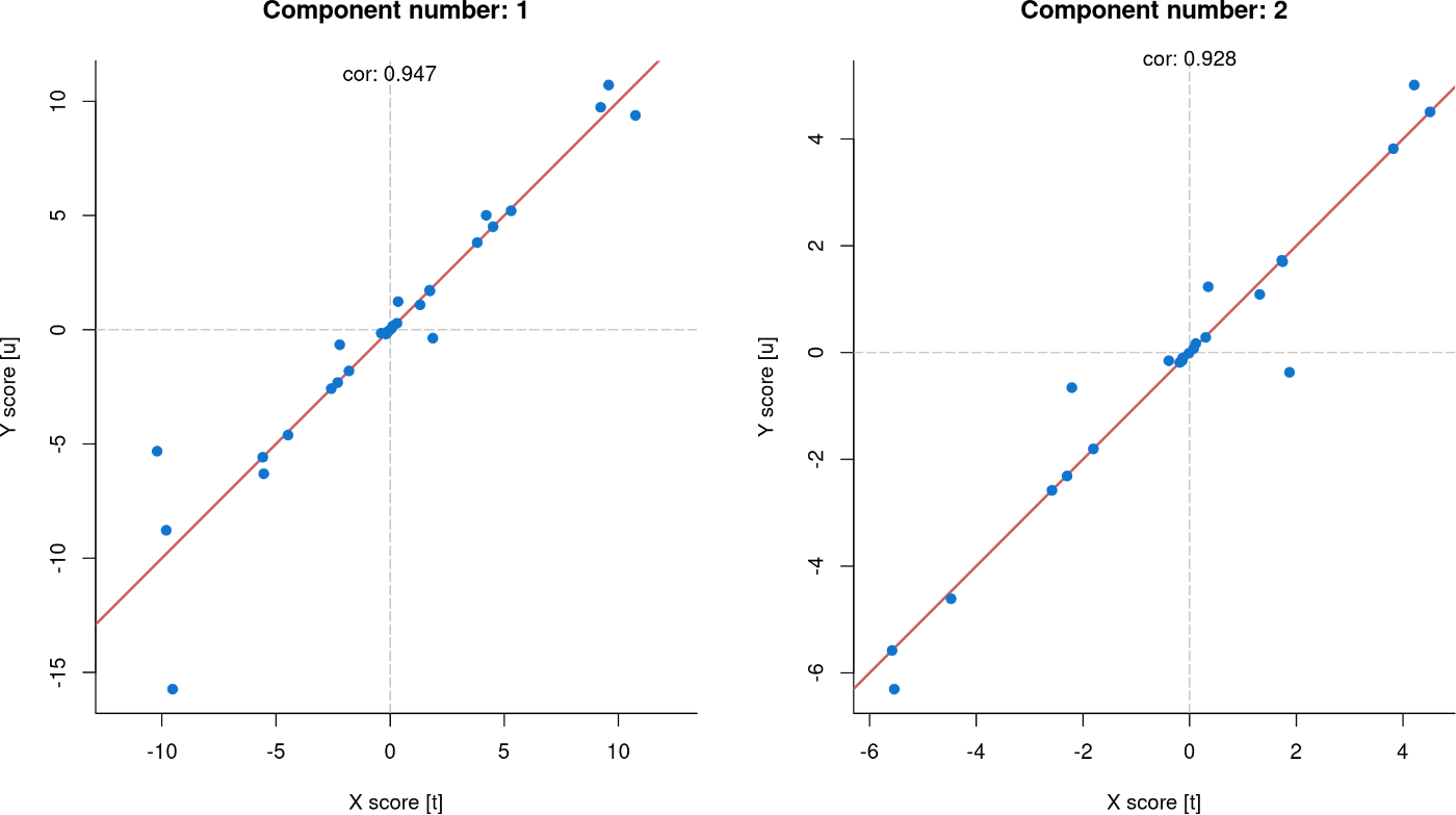 在MultiBaC中需要验证的一个重要方面是PLS模型中X和Y分数之间的内在相关性。正如我们之前指出的那样,《MultiBaC》函数默认情况下以数值形式显示此信息,但也可以调用可视化表示。