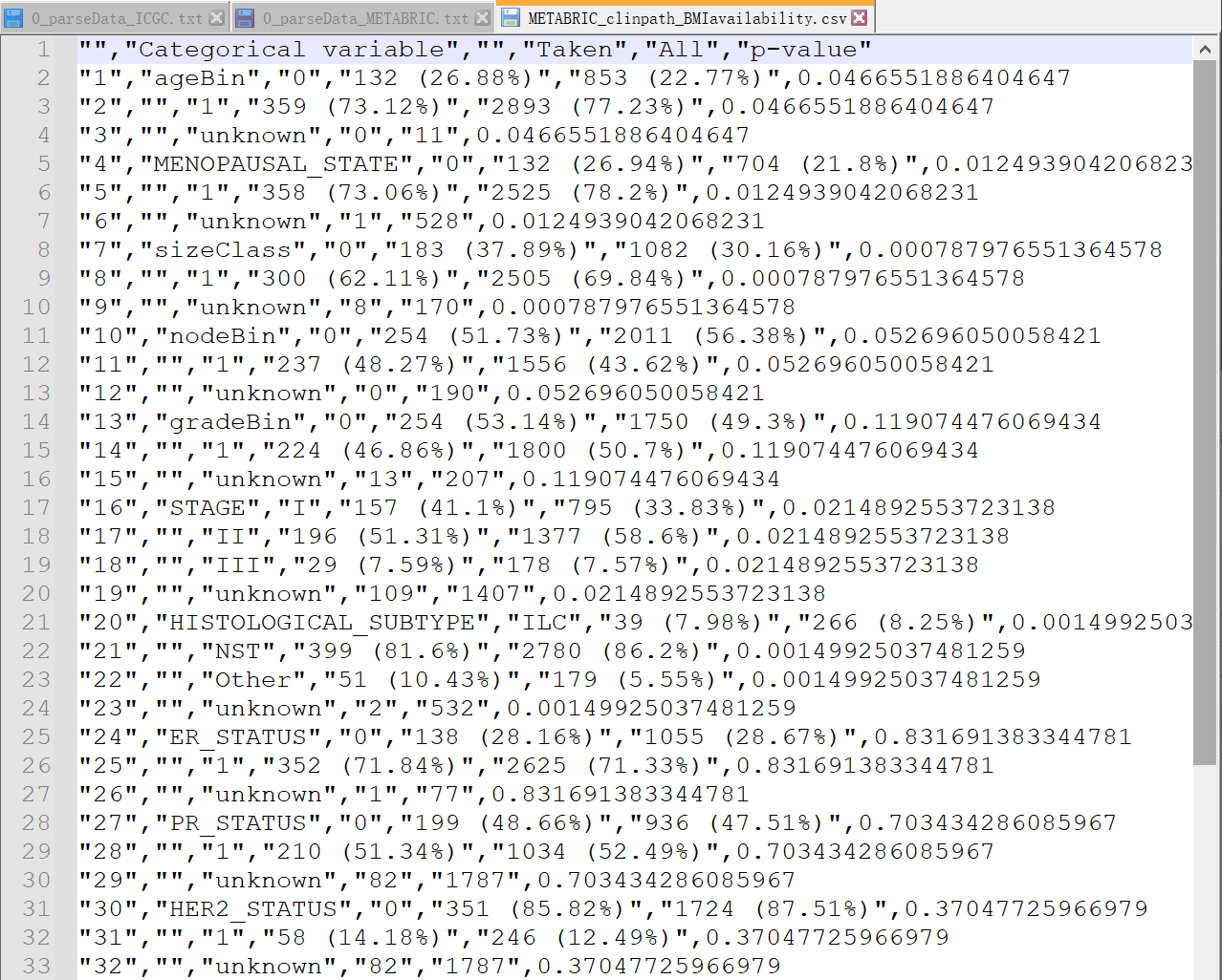 data_clinical_patient.txt中的是患有BC的病人的临床数据,METABRIC_clinpath_BMIavailability.csv中的数据则是METABRIC的BMI数据的可用性的和分类变量之间的相关性。
