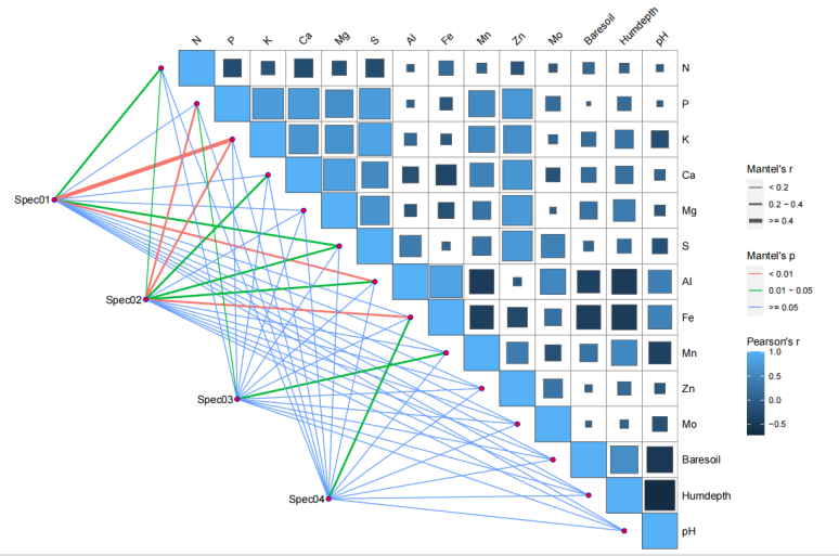 spec.select = list(Spec01 = 1:7,#依次定义四种物种作为Mantel的分析对象