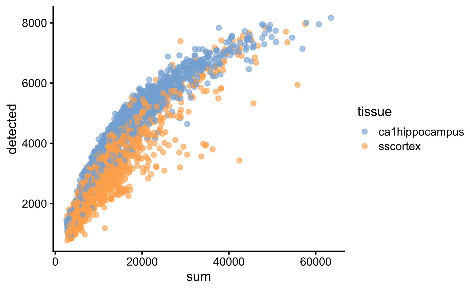 接下来,小果以上面的信息列为基础,接下来用scater的可视化功能展示count数和检测到基因数的关系,蓝色和橙色分别代表tissue下的ca1hippocampus和sscortex信息列。