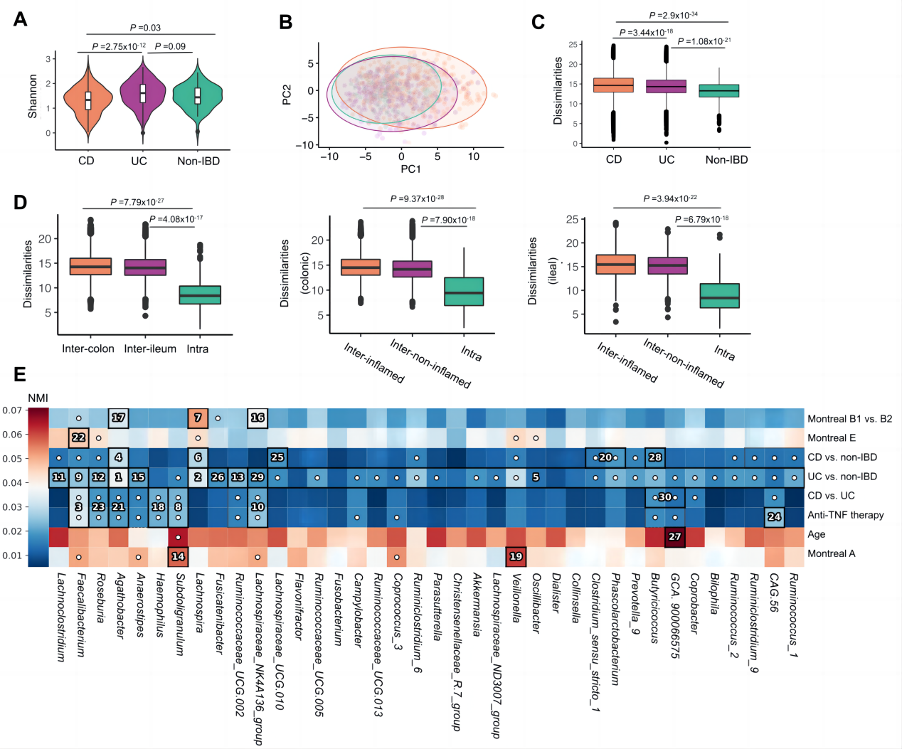 分析了活检样本中的粘膜微生物群组成并通过层次关联确定与单个微生物群相关的表型因素。观察到的最常见的细菌门是拟杆菌门,其次是厚壁菌门和变形菌门。有趣的是,观察到在结肠和回肠活检样本中的差异丰富的类群很少,这可能与炎症无关(图S2)。粘膜微生物群与炎症状态、组织位置和疾病位置没有显著的影响(图3E)。采样时的年龄、CD患者与对照组、UC患者与对照组、CD患者与UC患者的比较是与粘膜微生物群组成相关的主要因素。