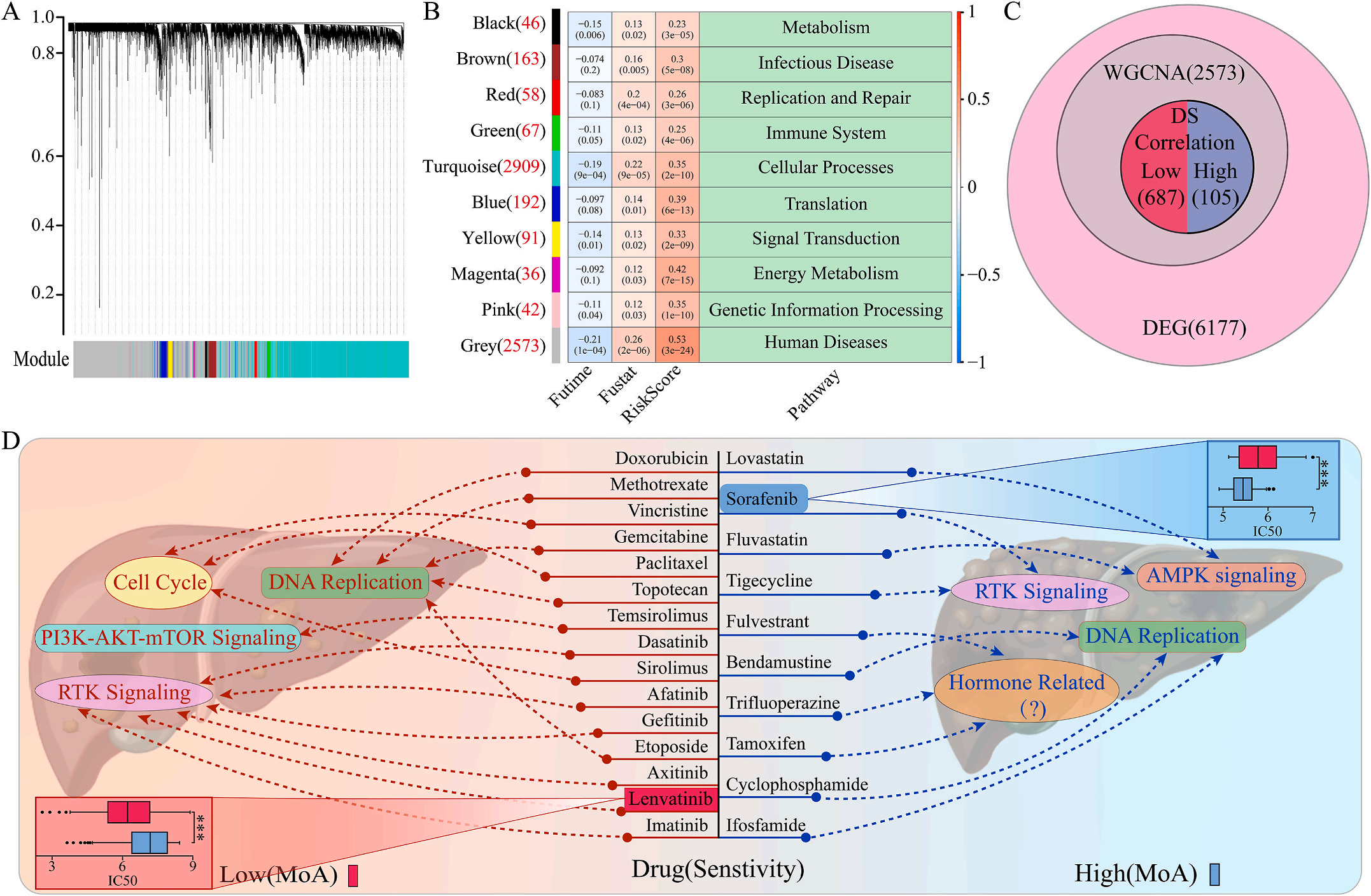 为了研究LIHC不同风险组的敏感药物,作者检测了6177个高低风险组差异表达基因(DEG),并通过加权基因共表达网络分析将其分为10个模块,其中灰色模块与预后风险和人类疾病具有明显的正相关性(图6A-B);结合GDSC和CTRP的数据集,利用脊回归模型计算对灰色模块中这些基因的药物敏感性。结果显示,包括洛伐他汀和索拉非尼在内的10种FDA批准的小分子药物对高危人群的105个基因具有更高的敏感性和微扰性;同时它显示了其他15种药物,包括阿霉素和乐伐替尼对低风险组的687个基因有更好的敏感性和扰动性(图6C-D)。此外,作者注意到大多数信号通路在高危组和低危组之间是相同的,但药物的敏感基因是不同的。因此,根据预后风险对患者进行药物选择是必要的。