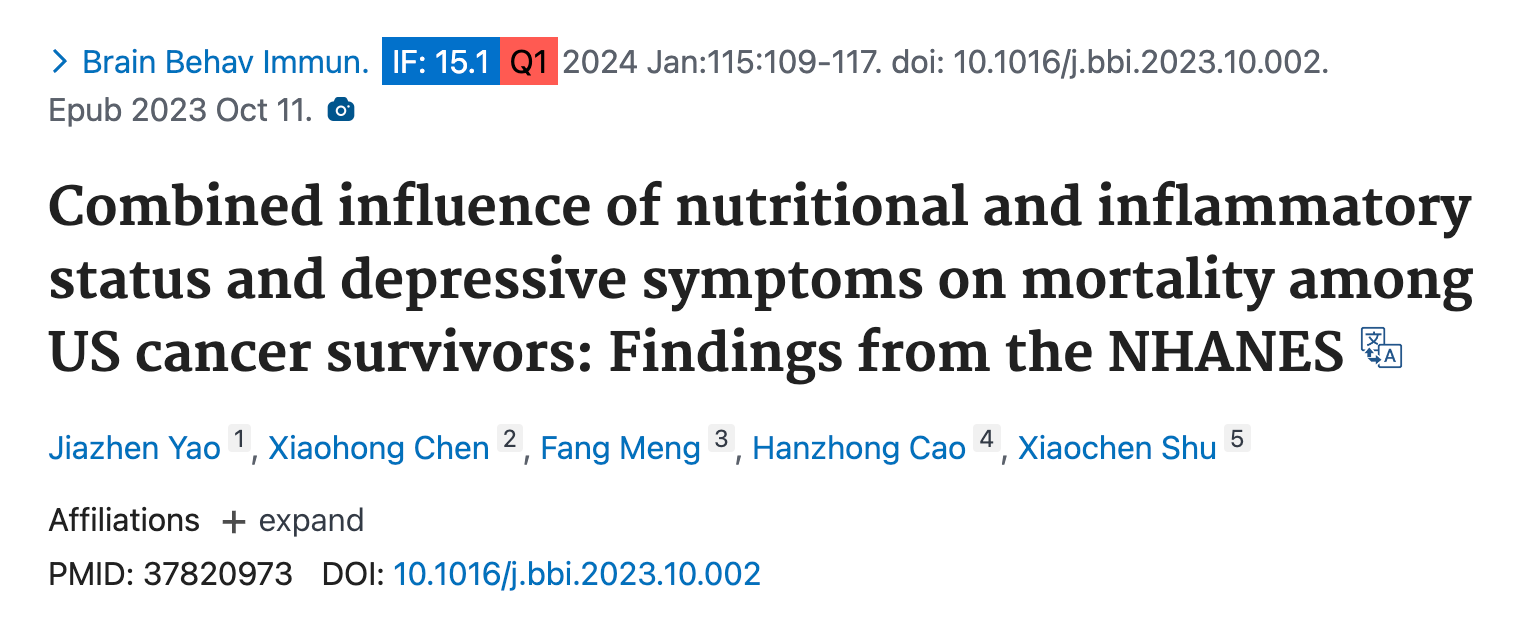 今天小云分享的文章来自南通大学附属肿瘤医院曹汉忠团队,他们对NHANES的数据进行挖掘,将营养、炎症和抑郁与癌症患者死亡率相关联,研究结果于今年1月发表在高达15分的期刊《Brain, Behavior, and Immunity》上,想知道他们是如何做到的吗,那就赶紧跟着小云一起来看看吧!