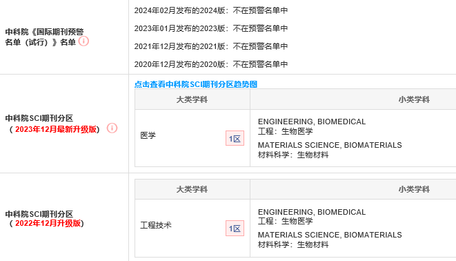 《Bioactive Materials》,生物医学,生物材料方向,ISSN: 2452-199X,出版国家:中国,月刊出版,JCR分区为1区,最新升级版中科院1区Top期刊,连续三年非预警期刊。