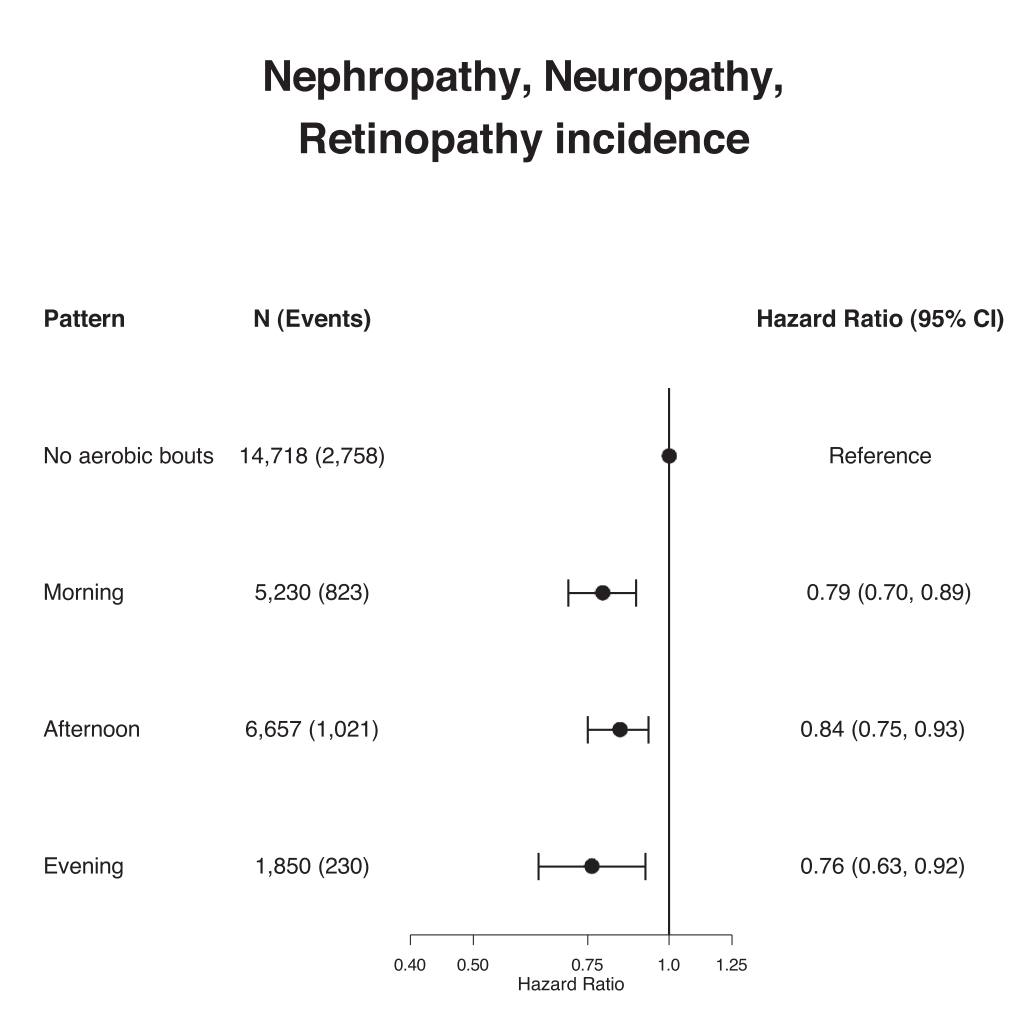 对于肾病、神经病和视网膜病的发生风险,早晨、下午和晚间进行中高强度体力活动(MVPA)的参与者的风险关联程度相似。在糖尿病患者中,晚间MVPA组的风险关联最强,而早晨和下午MVPA组的关联较小或无明显关联。