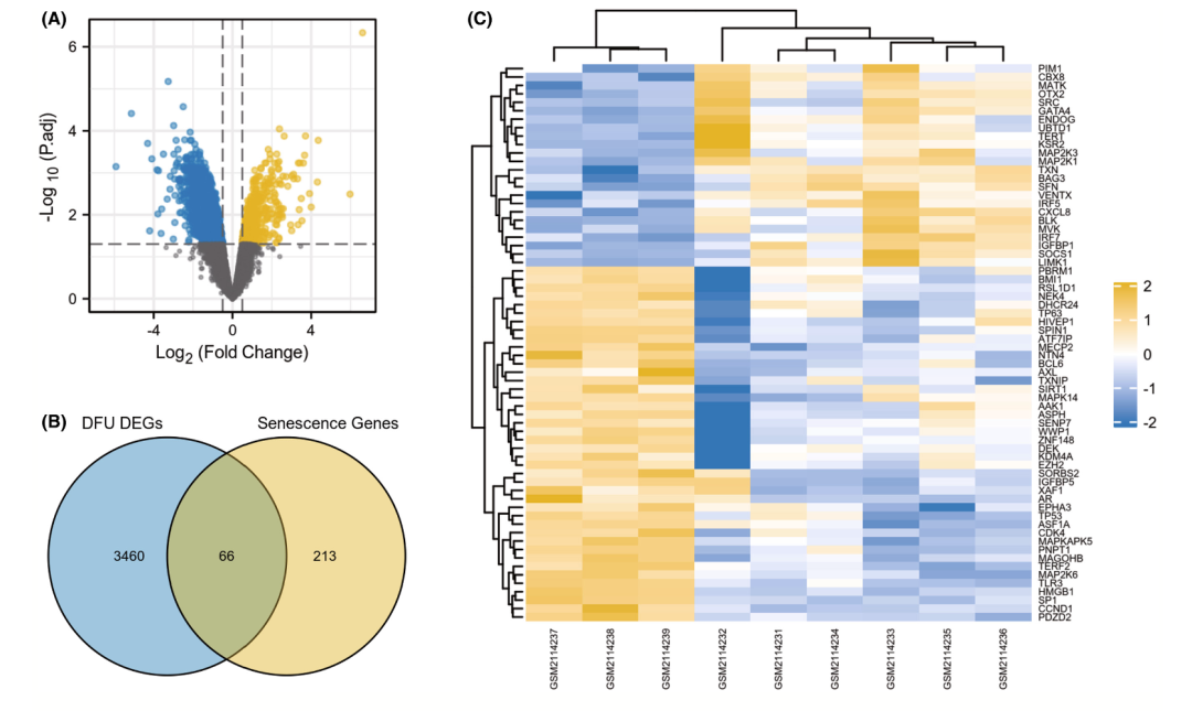 题目:通过综合转录组分析鉴定与糖尿病足溃疡细胞衰老相关的中心基因和通路