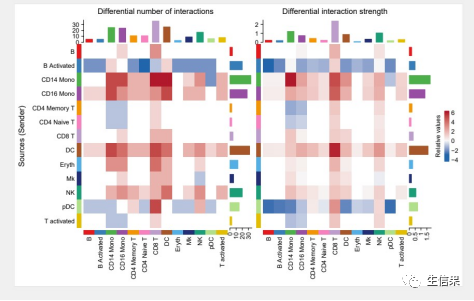 gg1 <- netVisual_heatmap(cellchat)gg2 <- netVisual_heatmap(cellchat, measure = "weight")pdf("netVisual_heatmap.pdf",height = 5,width = 8)gg1 + gg2dev.off()