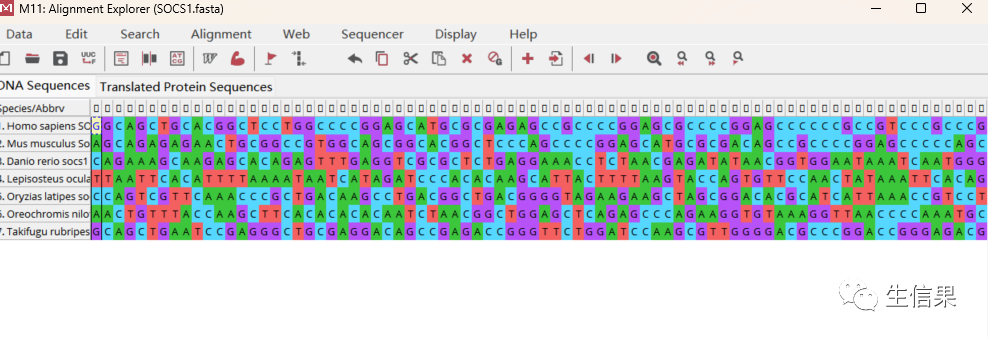 本文以SOCS1基因为例,通过NCBIhttps://www.ncbi.nlm.nih.gov/获取尼罗罗非鱼(Oreochromis niloticus)、斑点雀鳝(Lepisosteus oculatus)、青鳉(Oryzias latipes)、红鳍东方鲀(Takifugu rubripes)、斑马鱼(Danio rerio)、小鼠(Mus musculus)和人(Homo sapiens)的SOCS1基因fasta序列来进行进化树的构建。