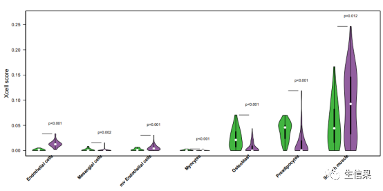 6、Stroma 细胞亚群中各个免疫细胞在各组表型样本中的相对含量小提琴图.不同颜色表示不同的样本表型,该图添加了显著性 p.value 值 。