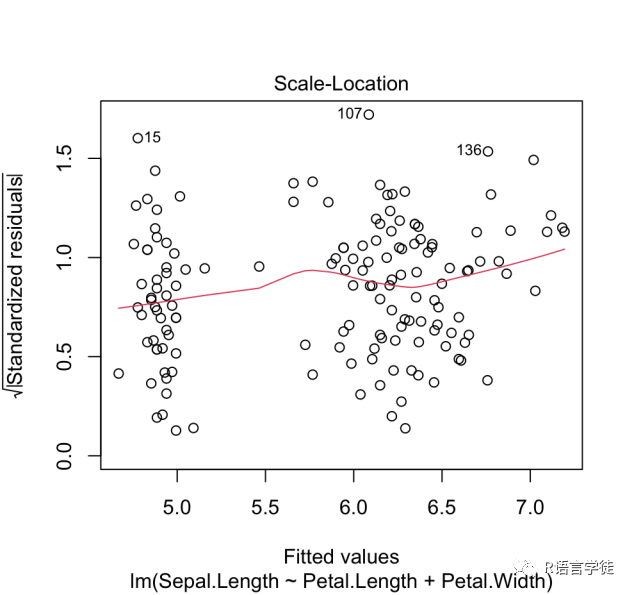 >library(car)>fit <- lm(Sepal.Length ~ Petal.Length + Petal.Width, data = iris)>plot(fit)