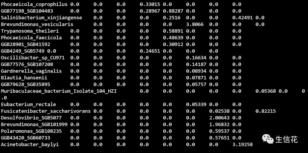 merge_metaphlan_tables.py metaphlan_output*.txt > output/merged_abundance_table.txt#筛选出不同水平物种丰度表格grep -E '(s__)|(clade_name)' merged_abundance_table.txt |grep -v 't__'|sed 's/^.*s__//g'|sed 's/ / /g'|sed 's/ /t/g' > merged_abundance_table_species.txtgrep -E '(g__)|(clade_name)' merged_abundance_table.txt |grep -v 's__'|sed 's/^.*g__//g'|sed 's/ / /g'|sed 's/ /t/g' > merged_abundance_table_genus.txtgrep -E '(f__)|(clade_name)' merged_abundance_table.txt |grep -v 'g__'|sed 's/^.*f__//g'|sed 's/ / /g'|sed 's/ /t/g' > merged_abundance_table_family.txtgrep -E '(o__)|(clade_name)' merged_abundance_table.txt |grep -v 'f__'|sed 's/^.*o__//g'|sed 's/ / /g'|sed 's/ /t/g' > merged_abundance_table_order.txtgrep -E '(c__)|(clade_name)' merged_abundance_table.txt |grep -v 'o__'|sed 's/^.*c__//g'|sed 's/ / /g'|sed 's/ /t/g' > merged_abundance_table_class.txtgrep -E '(p__)|(clade_name)' merged_abundance_table.txt |grep -v 'c__'|sed 's/^.*p__//g'|sed 's/ / /g'|sed 's/ /t/g' > merged_abundance_table_phylum.txt