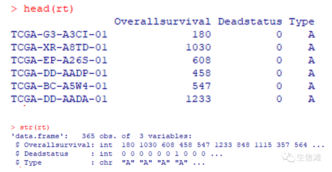 #首先导入R包library(survival)library(survminer)#导入临床数据df<-read.csv("clinical.csv",row.names=1,header=T,check.names=F)#获取想要的生存数据,包含生存期、死亡状态、风险类型(分组)rt=df[,c("Overallsurvival","Deadstatus","RiskType")]colnames(rt)[3]="Type"head(rt)