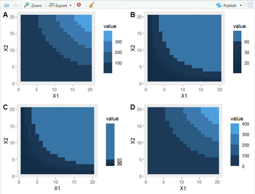 > df <- expand.grid(X1 = 1:20, X2 = 1:20)> df$value <- df$X1 * df$X2> p <- ggplot(df, aes(X1, X2)) + geom_tile(aes(fill = value))> p1 <- p + scale_fill_binned()> p2 <- p + scale_fill_binned(breaks = c(20, 30, 60))> p3 <- p + scale_fill_binned(+ breaks = c(20, 30, 60),+ guide = guide_coloursteps(even.steps = FALSE)+ )> p4 <- p + scale_fill_binned(guide = guide_coloursteps(show.limits = TRUE))> plot_grid(p1, p2, p3, p4, labels = LETTERS[1:4], ncol = 2)