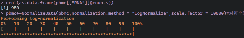 ncol(as.data.frame(pbmc[["RNA"]]@counts))pbmc<-NormalizeData(pbmc,normalization.method = "LogNormalize",scale.factor = 10000)#对每个细胞标准化.